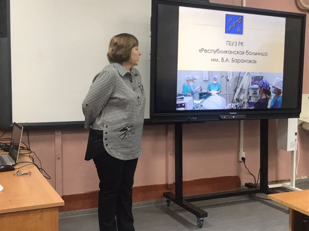 Заместитель главного врача по амбулаторно-поликлинической работе Светлана Васильевна Туманова рассказала об актуальных вакансиях и перспективах трудоустройства в ГБУЗ РК «Республиканская больница им.В.А.Баранова», разъяснила возможности получить целевое направление для поступления в медицинский колледж или в ПетрГУ на медицинский факультет. Более 35 учеников школы с заинтересованностью посетили данное профмероприятие.
