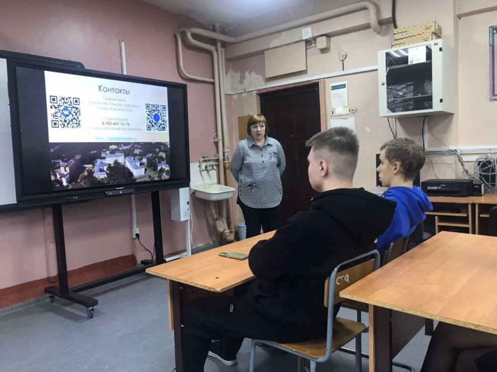 11 декабря 2025 года состоялся выезд в МОУ «Средняя образовательная школа №4» п.Ладва в рамках профориентации выпускников школы 9-11 классов. Мероприятие было организовано администрацией ГБУЗ РК «Республиканская больница им.В.А.Баранова» и проведено совместно с представителем ГАПОУ РК «Петрозаводский базовый медицинский колледж» Любовью Владимировной Крецула, социальным педагогом. Выпускникам школы объяснили правила приема в медицинский колледж, рассказали о специальностях и формах обучения.