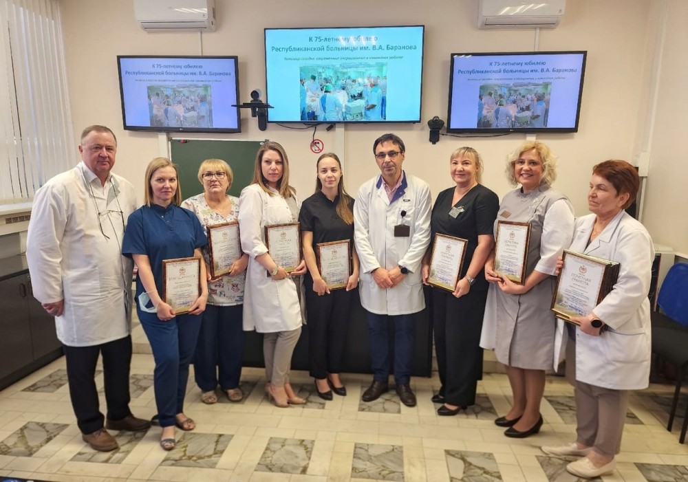 В продолжение праздничных мероприятий в честь 75-летия Республиканской больницы им.В.А.Баранова в пятницу 6 февраля в конференц-зале больницы прошло вручение ведомственных наград, учрежденных в Республиканской больнице им.В.А.Баранова нагрудных памятных знаков "За верность профессии", а также почетных грамот и благодарностей Министерства здравоохранения РК и учреждения.